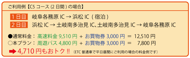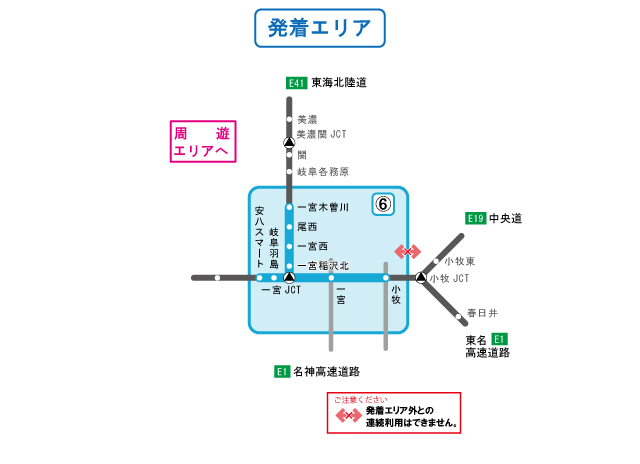 豊田ICや岡崎ICなど周遊エリア外のICからご出発の場合、連続走行により本プランをご利用可能ですが、周遊エリア外部分の高速道路料金が別途必要となりますのでご注意ください。