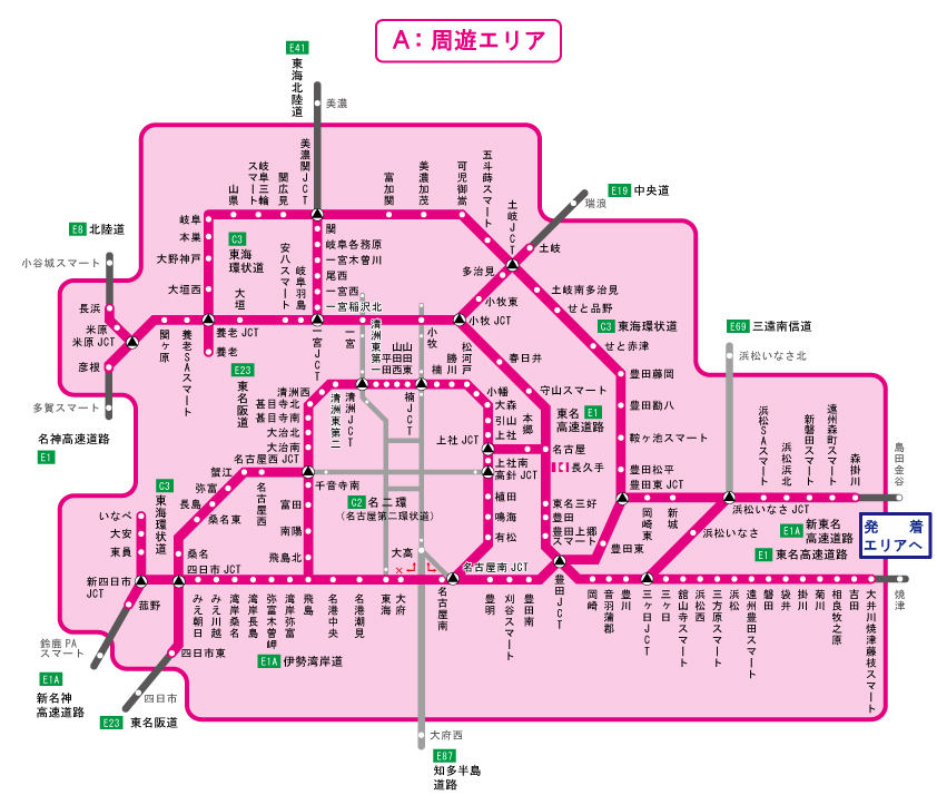 ! 周遊エリア外ICから流入して周遊エリア外ICで流出した場合は、たとえ周遊エリア内を走行しても本プランは適用されず、流入ICから流出ICまでの高速道路料金が請求されます。