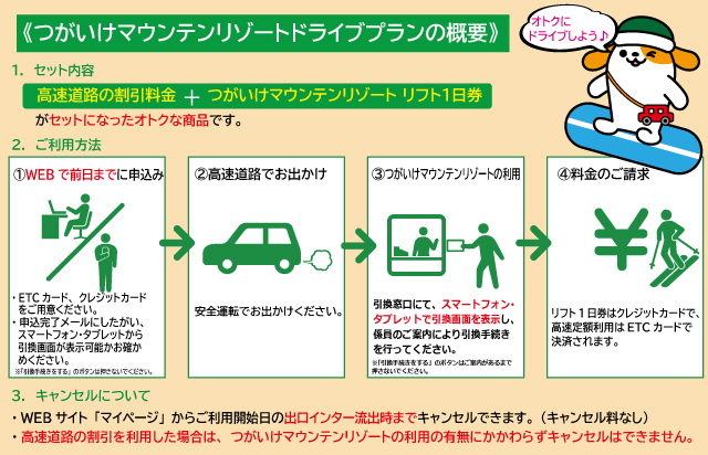 ※キャンセルが必要な場合は、「速旅」会員専用マイページから本プランのお申込み時にご登録いただいたご利用開始日(高速道路利用(出発)日)の最初の出口インターチェンジを流出する前まで(※ご利用開始日に高速道路を利用されない場合はご利用開始日の23:59まで)に手続きをしてください。この場合、高速道路周遊パス又はリフト1日券のいずれか一方のみの解約はできません。
