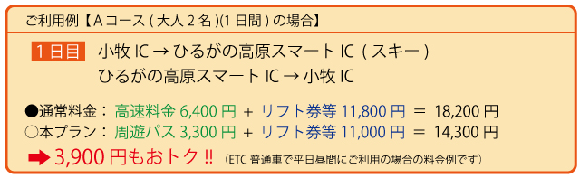 Case.1 平日昼間にご利用の場合(ETC利用の普通車、リフト券等:大人1名)