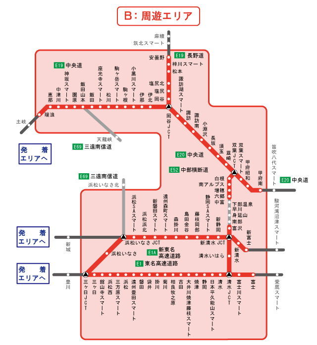 ! 周遊エリア内ICから流入しても発着エリア外ICで流出した場合(渋滞で流出した場合も含みます)や首都高速道路・一般道経由で発着エリア内ICで流出した場合は、復路走行とはなりません。本プランの料金とは別に周遊エリア外の部分の高速道路料金が請求されます。