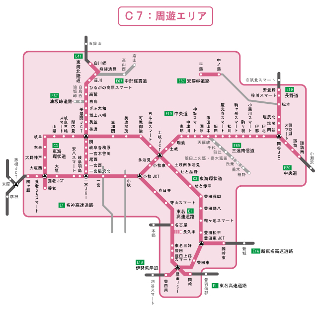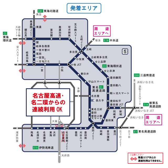 豊田ICや岡崎ICなど周遊エリア外のICからご出発の場合、連続走行により本プランをご利用可能ですが、周遊エリア外部分の高速道路料金が別途必要となりますのでご注意ください。
