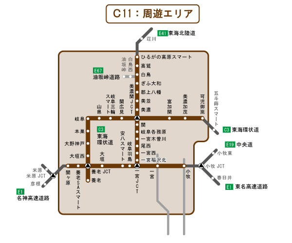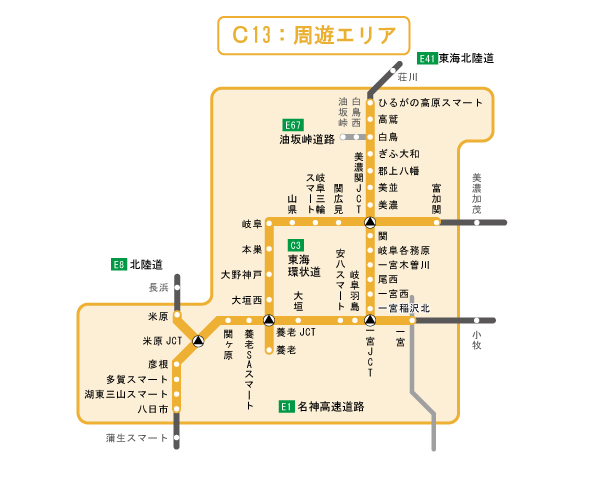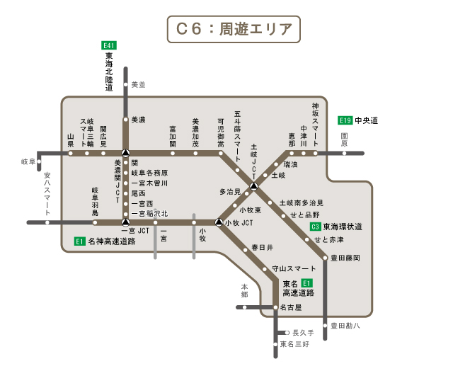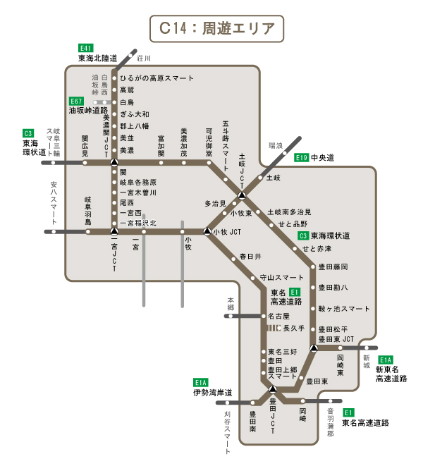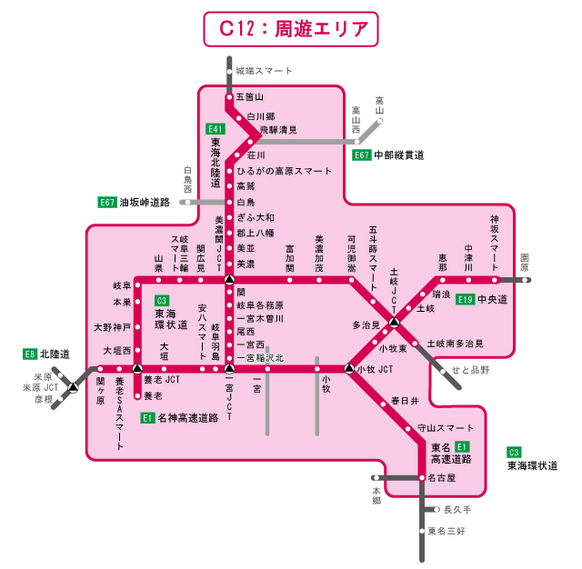 例)岐阜各務原ICや小牧東ICから流入した場合は本プランの利用開始とはならず、すべての走行が通常の高速道路料金となります。