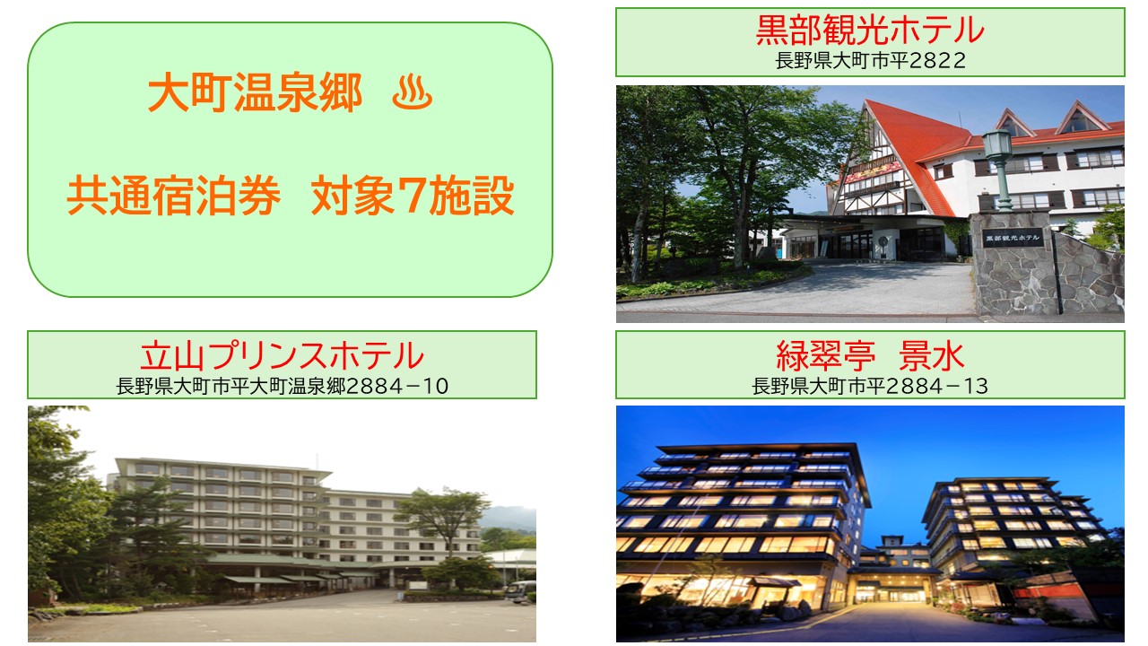 ! 宿泊予約は、本ドライブプランをお申込みされる方のお名前で行ってください。また、ご予約の際に「大町温泉郷 共通宿泊商品券付ドライブプラン」をご利用の旨をお申し出ください。