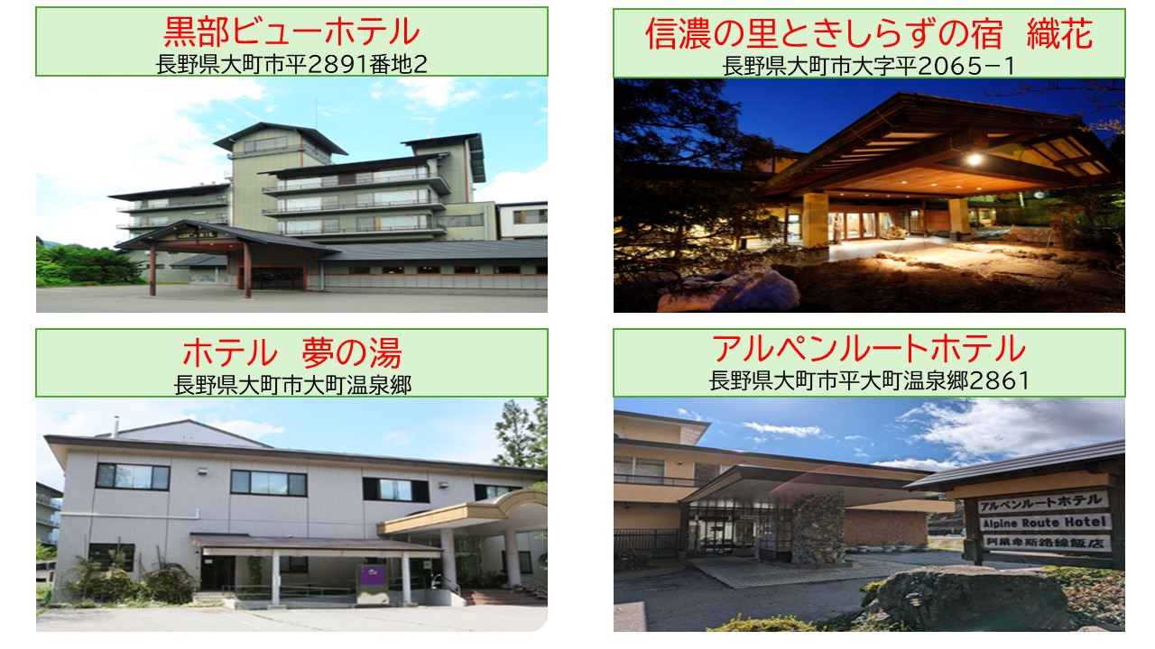!宿泊予約は、本ドライブプランをお申込みされる方のお名前で行ってください。また、ご予約の際に「大町温泉郷 共通宿泊商品券付ドライブプラン」をご利用の旨をお申し出ください。